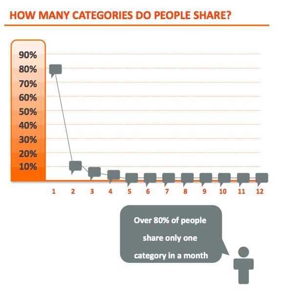 Tout le monde peut être un influenceur lorsqu’il s’agit de partage de liens sur le web. L’étude nous apprend qu’un grand nombre de personnes sont influentes sur un ou deux sujets qui leur sont importants. C’est-à-dire, le partage est démocratique.