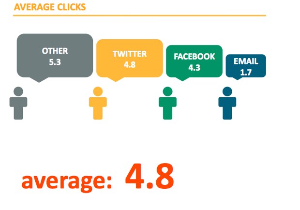 Based on volume, links shared on Facebook generates the biggest number of clicks. But Twitter actually garners the higher number of clicks per link.
